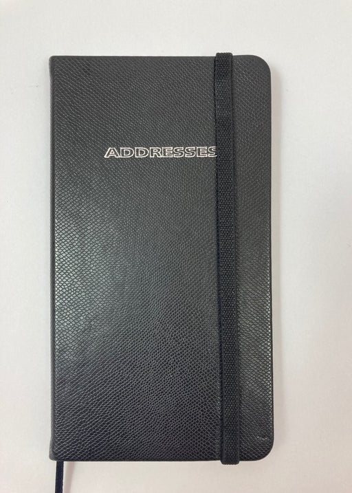 View full detailsSlim black address book with elastic slim hard black cover Includes document pocket and backup information