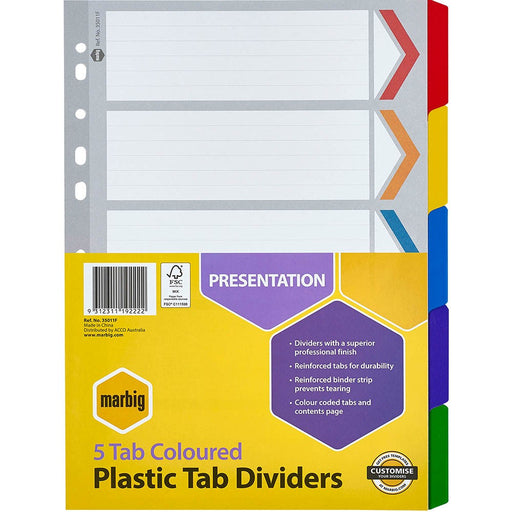 These Marbig dividers are A4 in size with five tabs to help get you organised and stay in control of your documents. Features: Brightly coloured ...